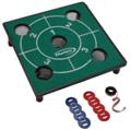 Toss the rings onto the pins on the playing board and win.