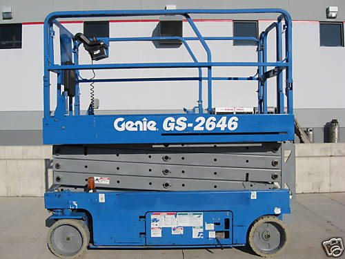 Genie GS2646 Scissor Lift has a 26' work platform and gives you a working height of 32'. Platform width is 46'' lenght is 7'5''/10'5''ext. Lift capcity is 1000#. For use indoors on solid surfaces. Proportional controls for lift and drive functions AC wiring to platform Multiple disc brakes provide smooth deceleration Manual platform lowering valve Tilt sensor with an audible alarm Pothole guards Emergency stop switches at both platform and ground controls Automatic 25 amp battery charger Manual brake release Non-marking tires Hour meter