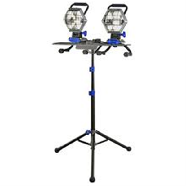 Work light twin tower on stand. Has two adjustable light. Connect to standard 110 plug in. Approximately 4.8-ft telescoping tripod with adjustable leg for leveling on uneven surfaces • Tempered glass lens with metal safety grill ****similar to photo***
