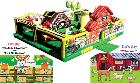 The My Little Farm™ educational inflatable structure is designed to educate and entertain toddlers in an adorable fram setting. This game offers a small climb and slide and several 3D animals and structures, such as a dog, horse, chickens, hay stock and a cactus. A ball pond is included in this bouncy castle, where kids can learn colors with plastic balls and coordinating baskets for collecting. My Little Farm™ makes education fun with several vinyl patch games along the bouncy house's walls. Kids can try to Find My Number counting game, matching objects to their correct number. Find My Other Half enhances matching skills by matching pieces in yummy fruit shapes, and Who Am I gives a toddler lesson in zoology by matching animal shapes with their names.