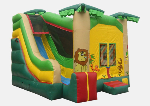 4 in 1 Jungle Combo Has 15x15 bounce area, basketball goal, climber to slide, and slide.