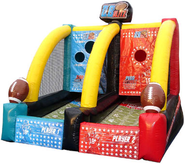 Get that throwing arm ready, the Quarterback Blitz will have potential NFL quarterbacks lining up for their chance at a first down. This inflatable game allows one QB to look for an opening as he or she tries to complete a pass in their opponent's field. At the same time, the opponent is busy loading the QB's space with as many footballs as possible, making for frenzied, blitz-like plays! With its 3D footballs, a green turf ''field'' and large yellow-goal posts, this game will really put players on the field. The QB Blitz inflatable game will add authentic football entertainment to your next event or tailgate party.