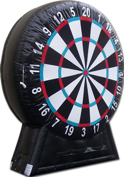 The Bull's Eye 2 in 1 inflatable game offers traditional games with a twist at your next big party. This inflatable play structure offers two games in one impressive, inflatable unit, including a dart game in which a feather shuttlecock is thrown instead of a dart and a bow and arrow game where contestant use a plastic crossbow with velcor darts to hit the target. For those looking for floor action, the unit can be tilted to reveal a two-hole golf putt, perfect for sneaking in some extra practice to improve the golf game! The Bull's Eye comes in traditional blue, red, white and black pub colors, sure to attract players all day long.