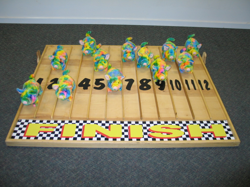 This great group race game provides a lot of excitiment. This board has lanes numbered 1 to 12 and comes with a starting bar. Uses bright multi colored racing pigs that are battery operated.