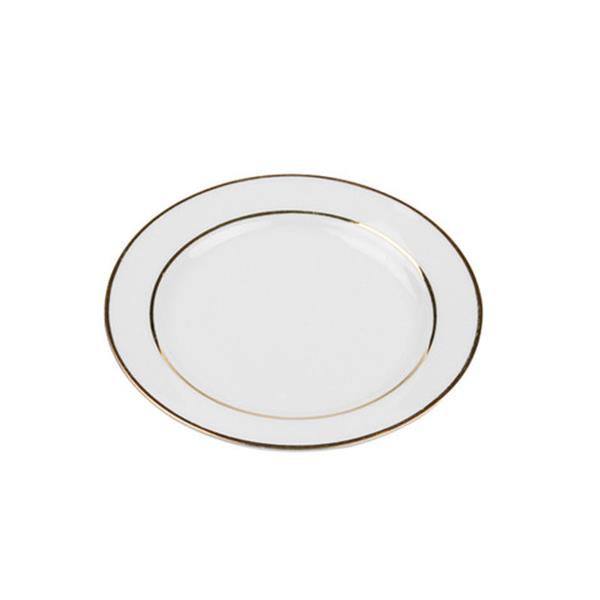 White 6'' dessert plate with gold rim.
